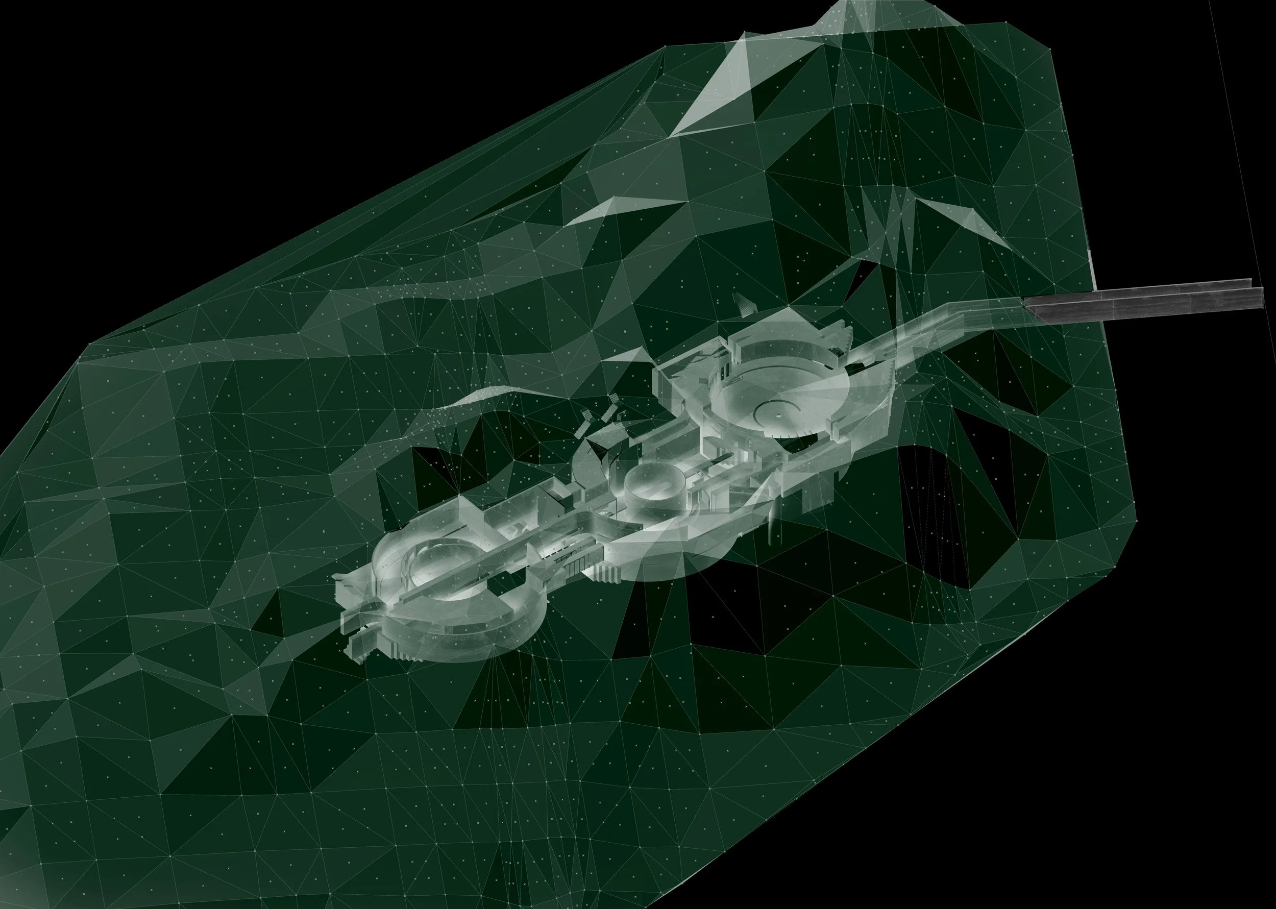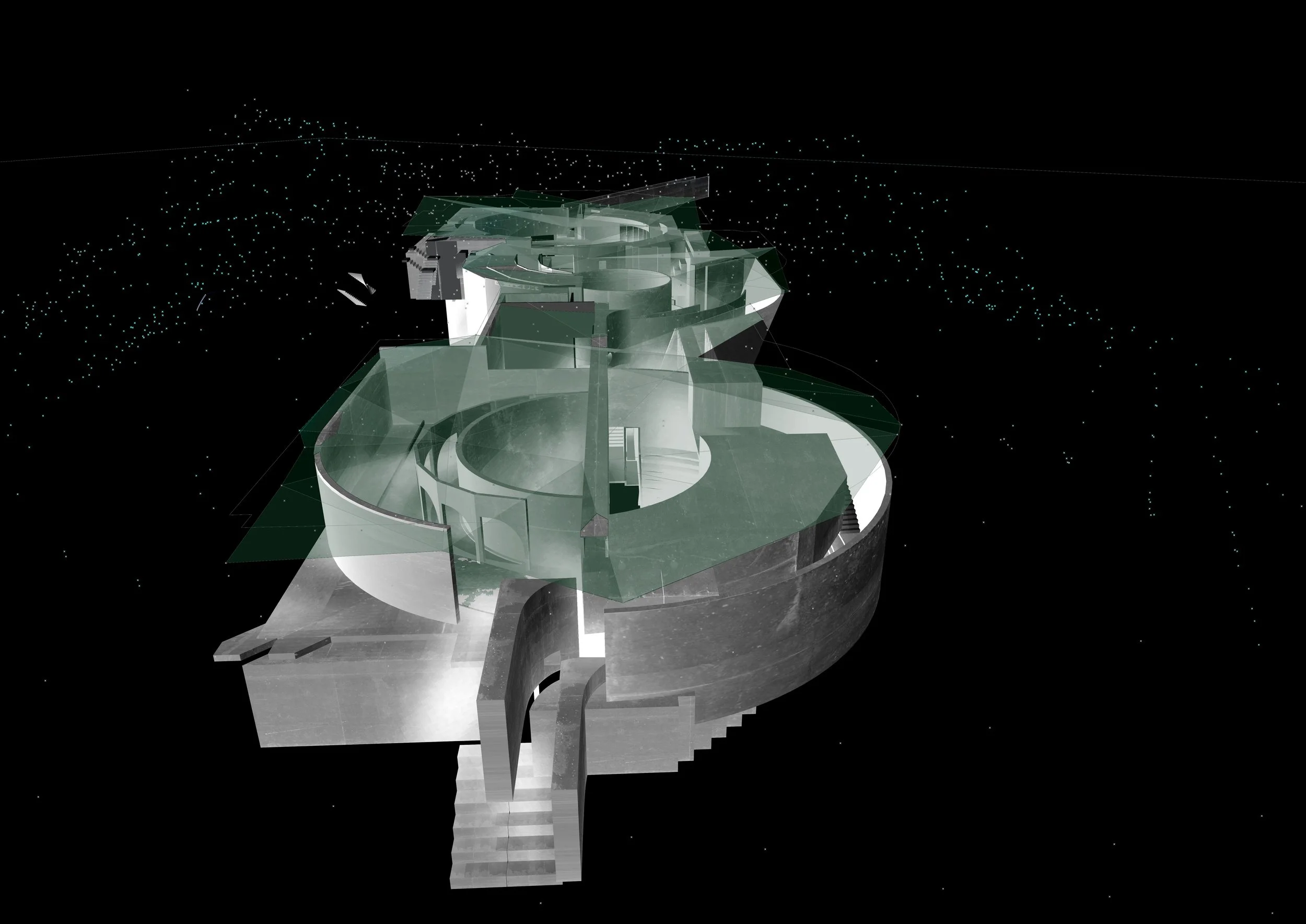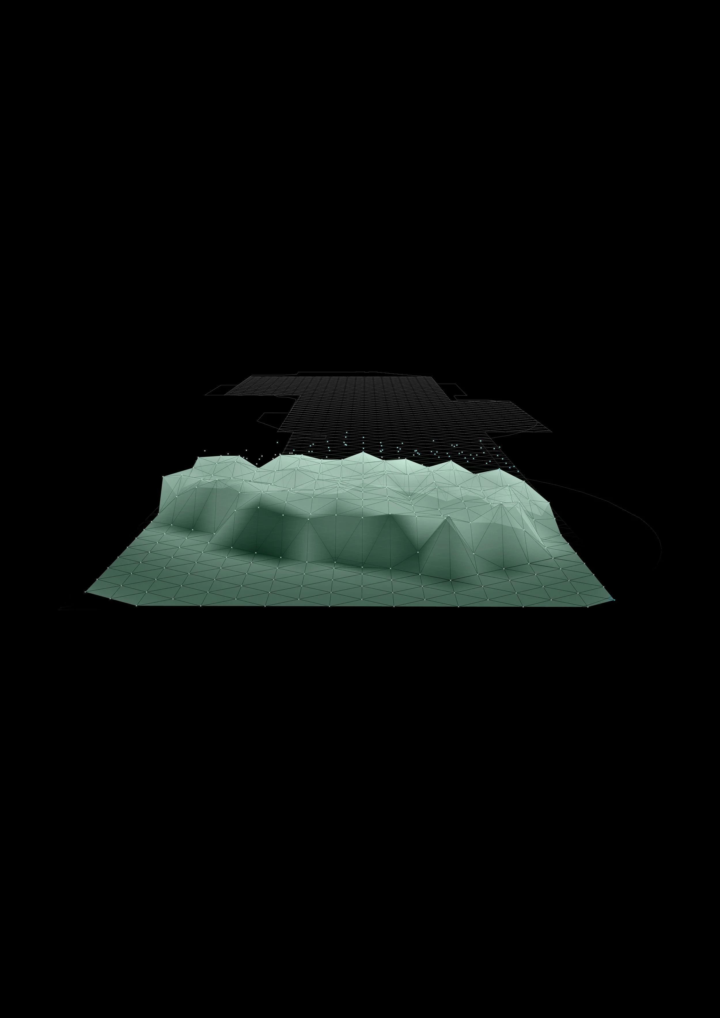 Located, on the island of the Lago Mayor in Mexico City, the Cartographic Library houses maps of places that never existed. The library is built underground, assimilating the island’s topography, camouflaging itself while resurfacing the site. Upon retrieving a map from the underground archive, the viewers can use the laser infrastructure on the roof to recreate the imaginary/phantom place through a triangulated laser-scape of the map’s topographic character.