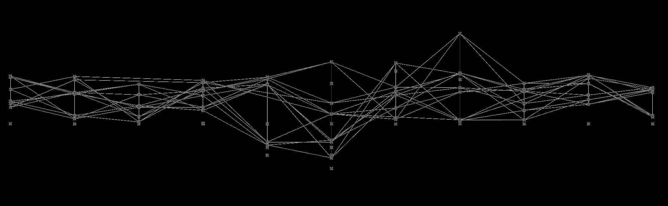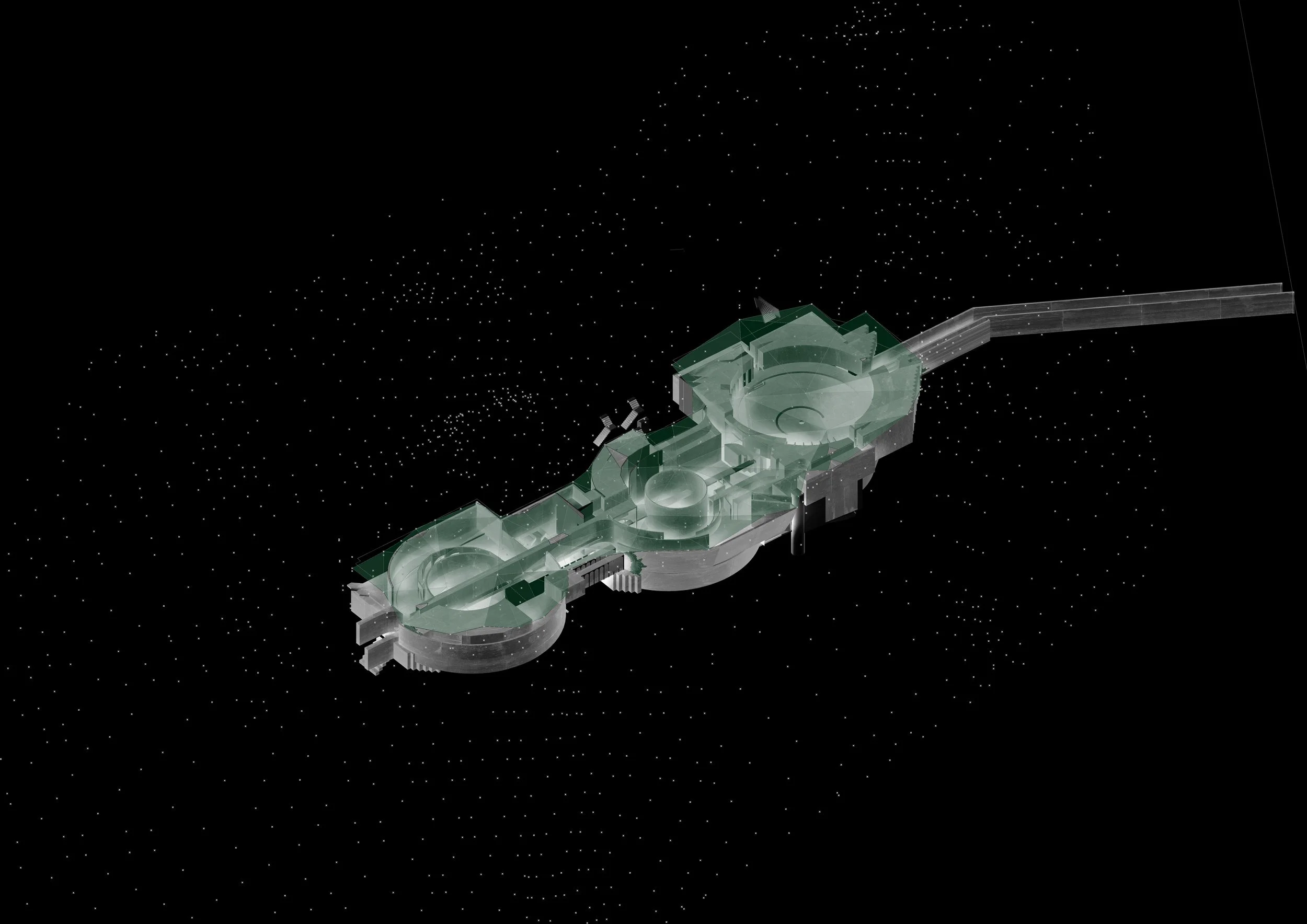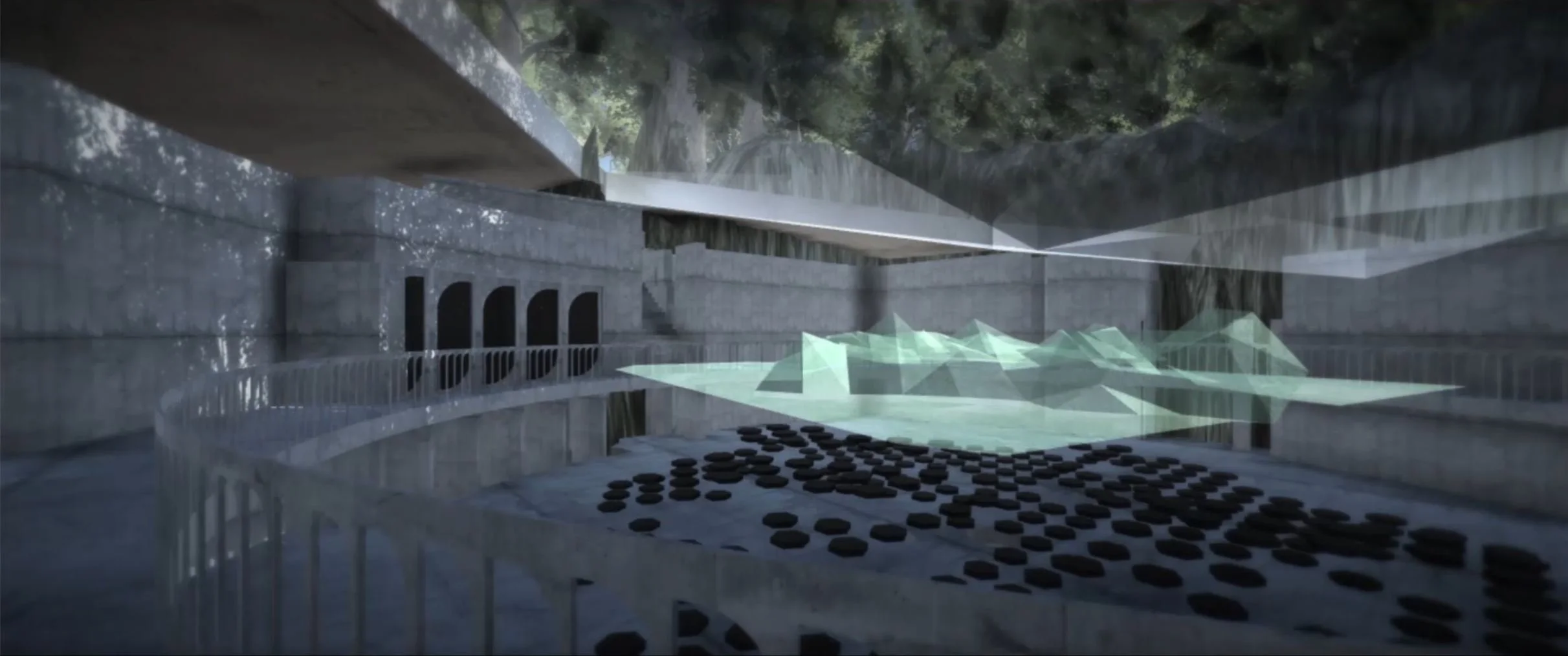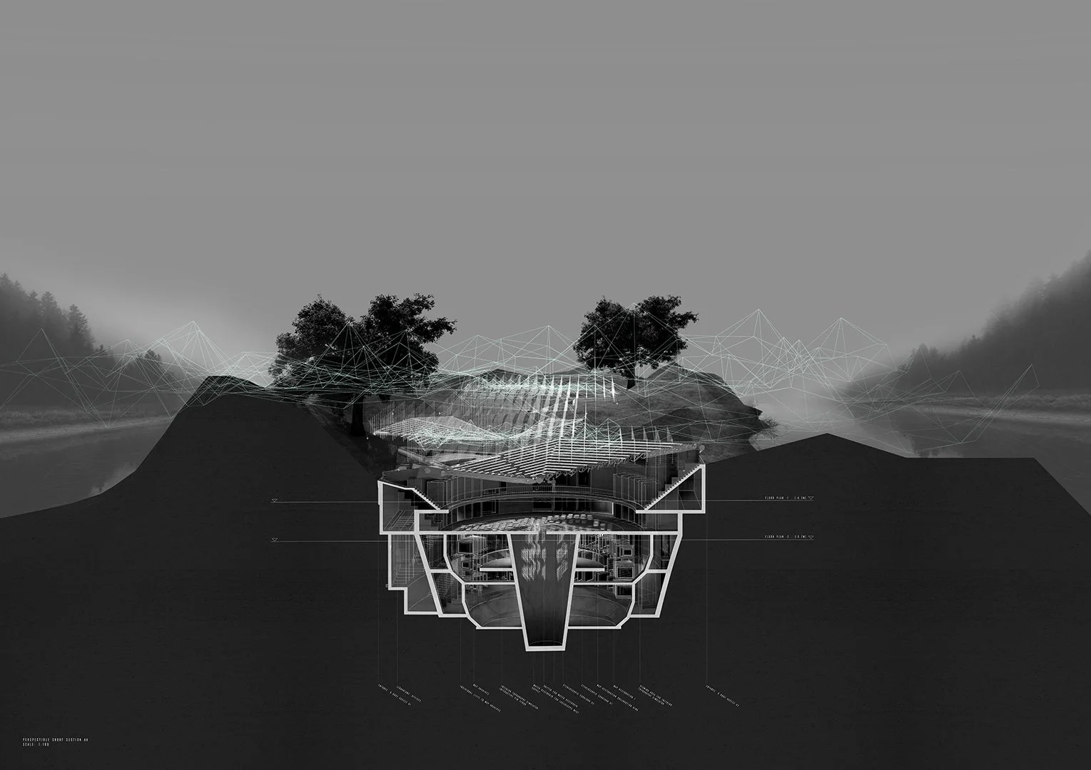 Located, on the island of the Lago Mayor in Mexico City, the Cartographic Library houses maps of places that never existed. The library is built underground, assimilating the island’s topography, camouflaging itself while resurfacing the site. Upon retrieving a map from the underground archive, the viewers can use the laser infrastructure on the roof to recreate the imaginary/phantom place through a triangulated laser-scape of the map’s topographic character.